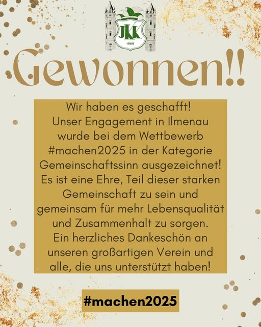 Wir freuen uns riesig, beim Wettbewerb #machen2025 für unser Engagement in Ilmenau mit dem Preis in der Kategorie Gemeinschaftssinn ausgezeichnet worden zu sein. Gemeinsam haben wir bewiesen, wie viel Zusammenhalt und Kreativität in unserer Region stecken. Ein herzliches Dankeschön an unseren großartigen Verein und alle, die uns unterstützt haben!